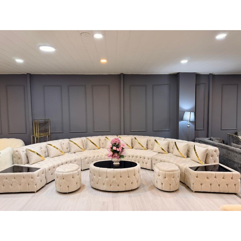 Setul include canapeaua 9 metri, realizată din catifea premium într-o nuanță elegantă de bej, completată de perne decorative cu detalii aurii, care adaugă un plus de rafinament. Datorită dimensiunii sale generoase, canapeaua oferă spațiu amplu pentru relaxare și socializare, fiind ideală pentru familii numeroase sau pentru amenajarea unui living impunător.
