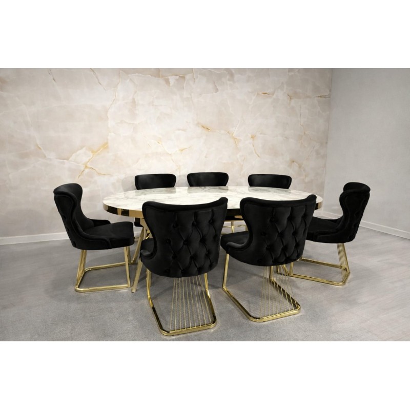 Set masă dining lux ovala 170x90 cm fixa cu 6 scaune tapițate – design elegant cu accente aurii