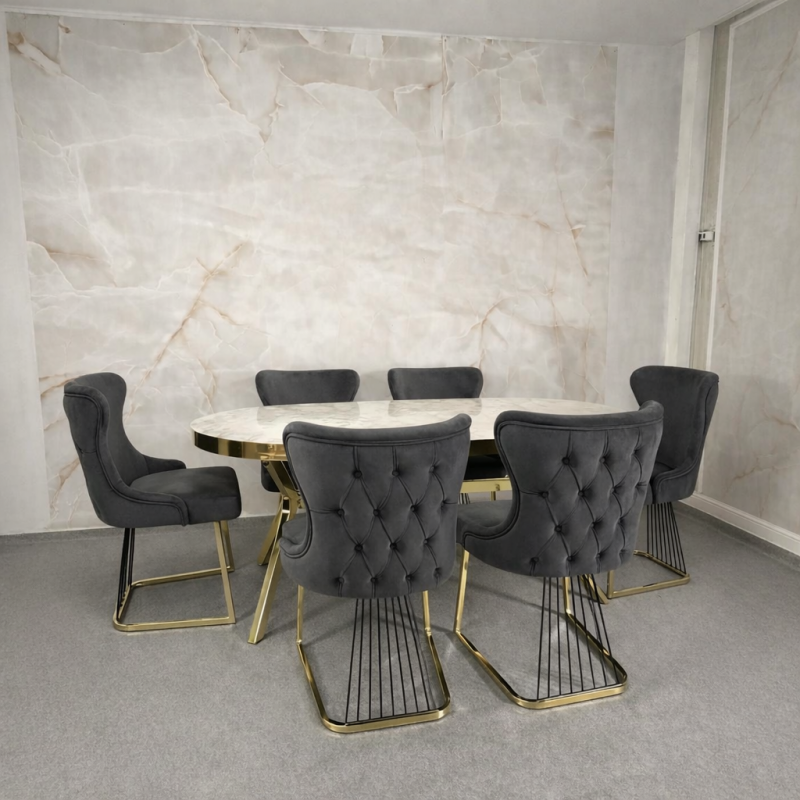 Masa impresionează prin designul său contemporan, cu blat generos și rezistent, susținut de o bază metalică stabilă în finisaj auriu, care adaugă un aer premium întregului ansamblu. Scaunele sunt tapițate cu material textil catifelat într-o nuanță elegantă de gri antracit, având spătar ergonomic și detalii rafinate ce oferă atât confort, cât și un aspect luxos.