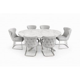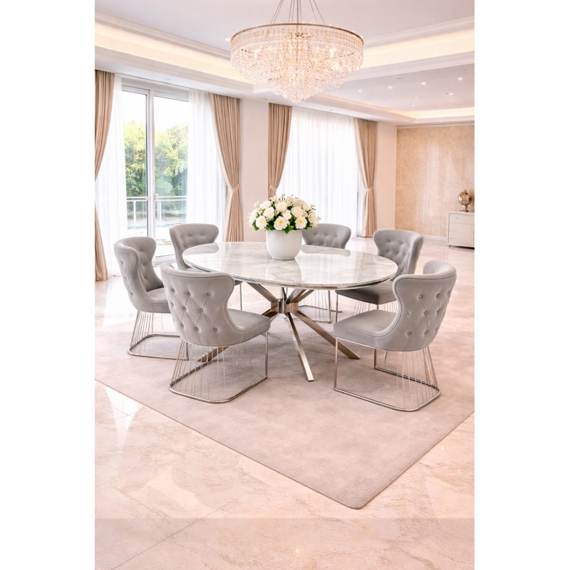 Set masă dining lux ovala MDF 170x90 cm fixa cu 6 scaune tapițate – design elegant cu accente argintii